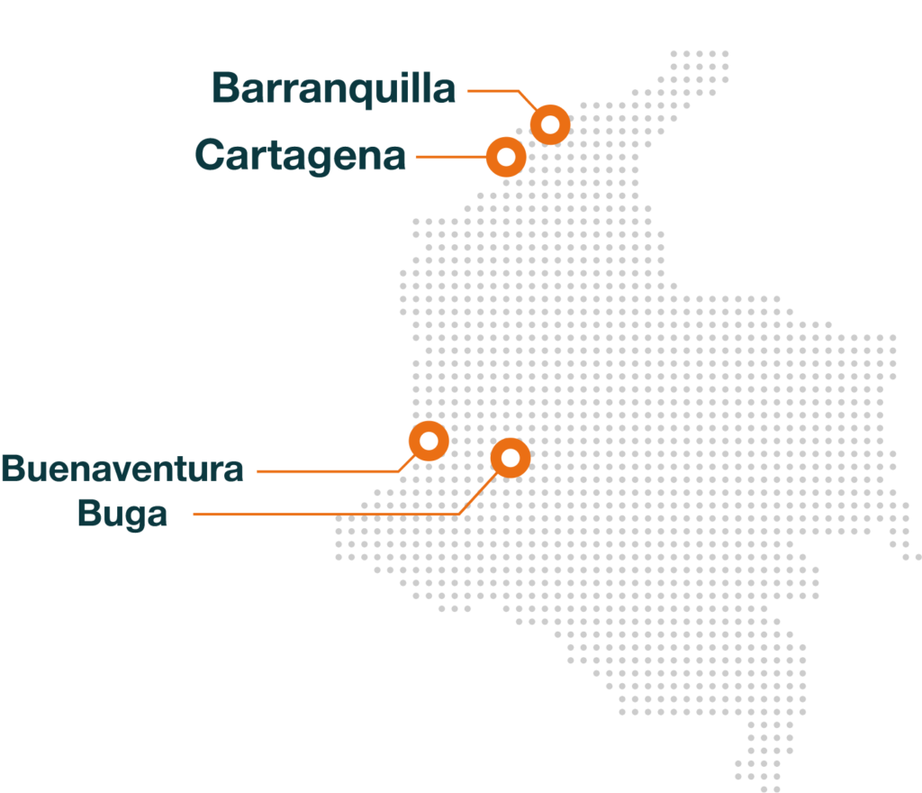Nuestra red estratégica de operaciones nos permite cubrir los principales puertos del país. Desde estos puntos conectamos el comercio nacional e internacional con los centros de producción y consumo más importantes de Colombia.